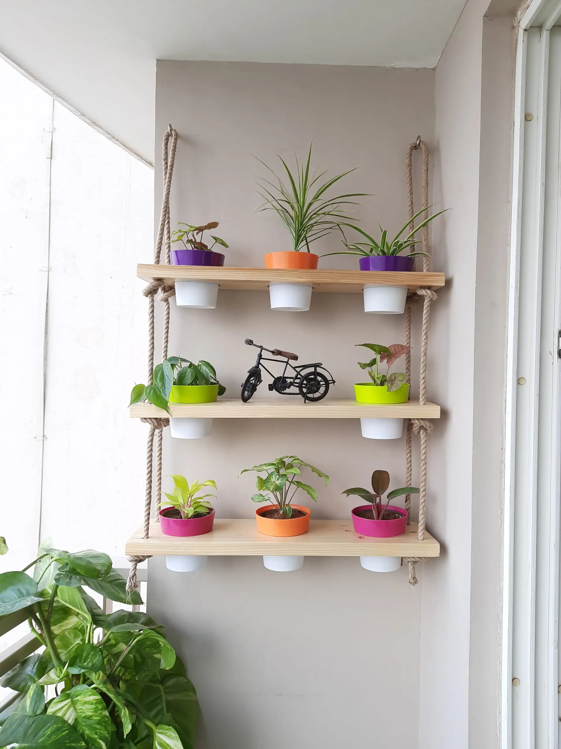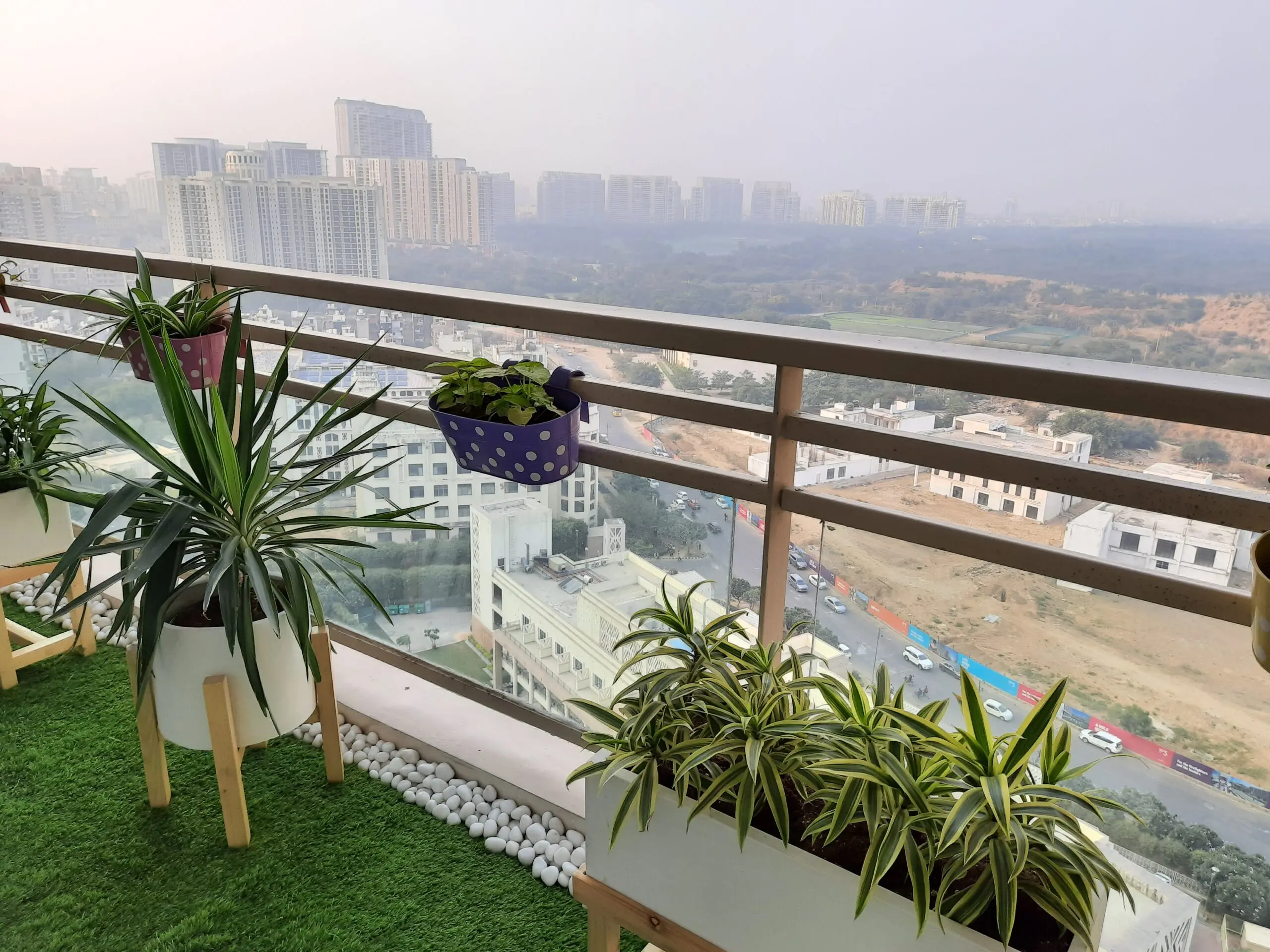 This tropical balcony garden makeover at DLF Park Place, Gurugram transforms a compact space into a vibrant yet functional outdoor retreat. Customised wall décor creates a bold focal point, while wall-mounted shelves and planter stands maximise vertical space. Layered tropical plants, railing planters, artificial grass flooring, and decorative white pebbles add texture and depth. The result is a low-maintenance, garden-inspired balcony design that blends greenery, structure, and everyday functionality.