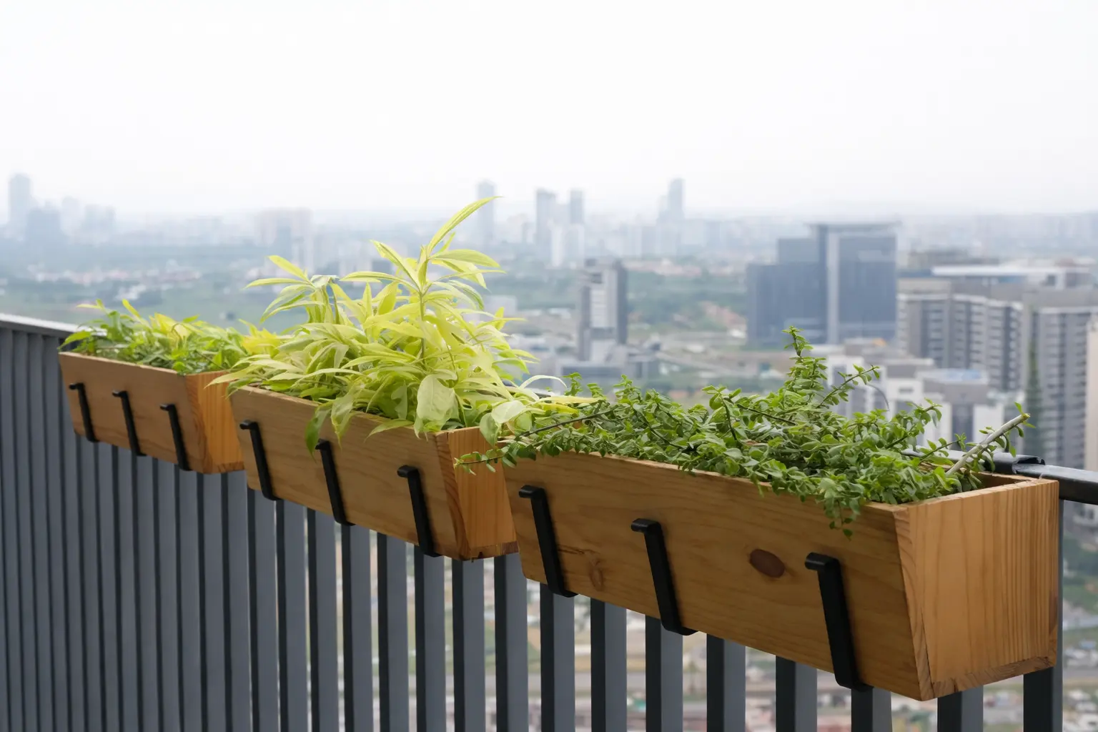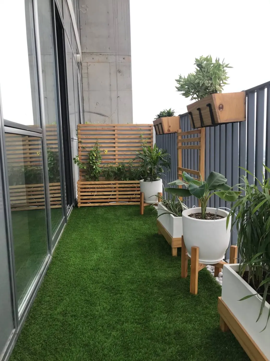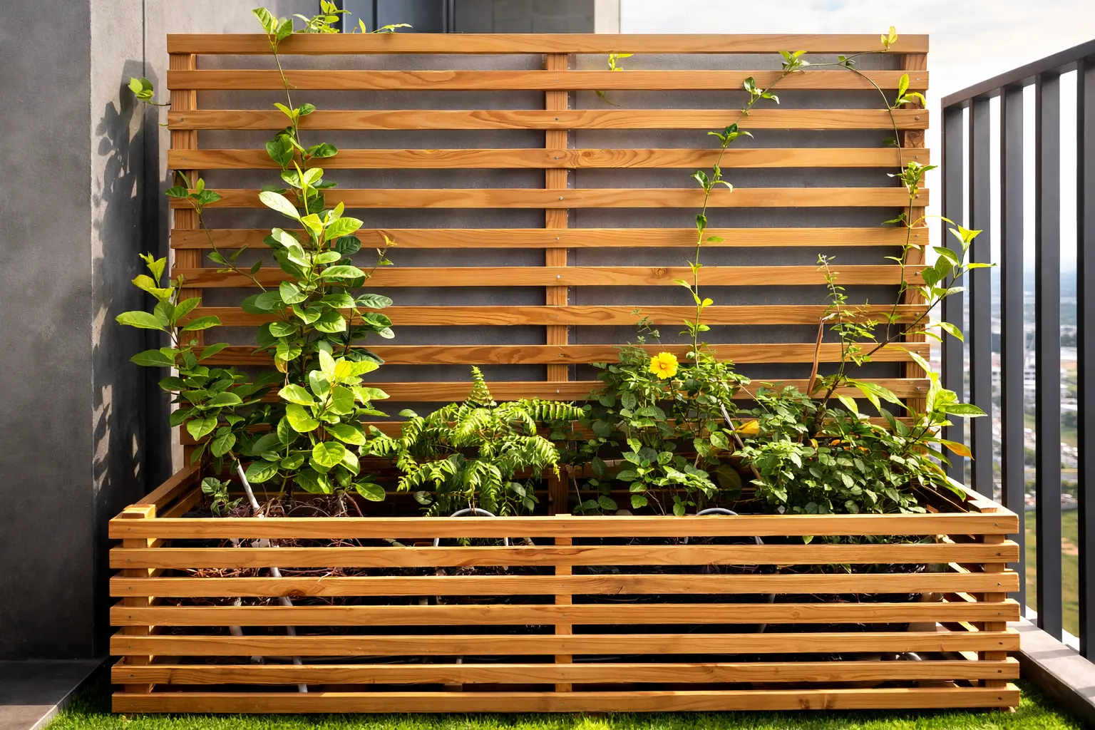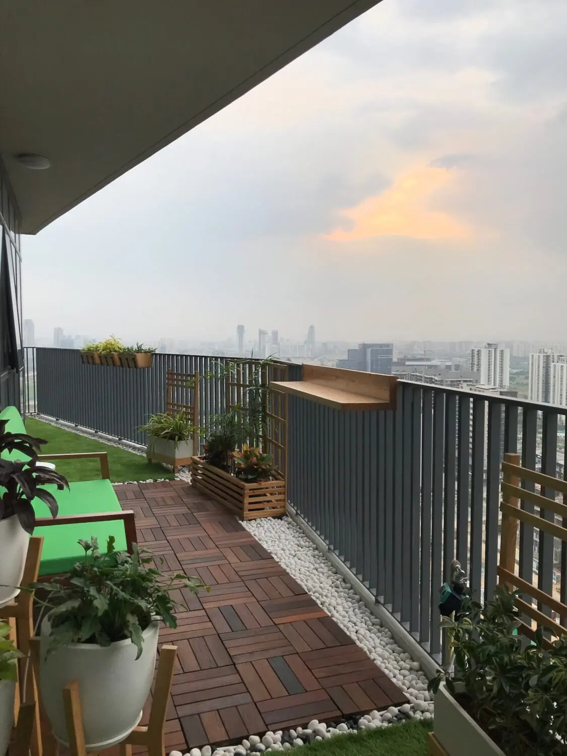 Spacious Balcony Garden with Custom Wooden Planters, Deck Flooring & Swing