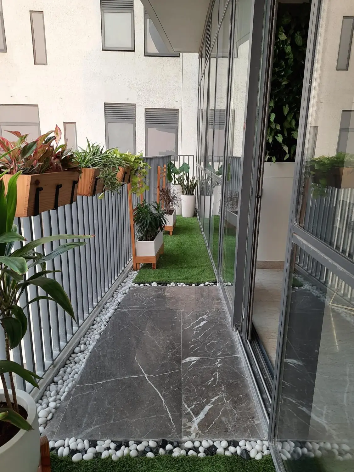 This 400 sqft balcony garden at Ireo Skyon, Gurugram blends wooden deck tiles, artificial grass, and custom-built planters to create a layered outdoor living space. Railing planters and a railing table maximise functionality, while a hanging swing and 3-seater outdoor sofa define relaxed seating zones. Pebble borders and structured greenery add depth, making this a thoughtfully designed balcony garden that combines comfort, greenery, and modern outdoor aesthetics.