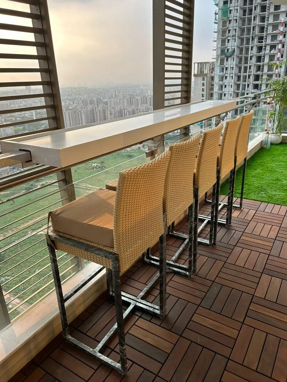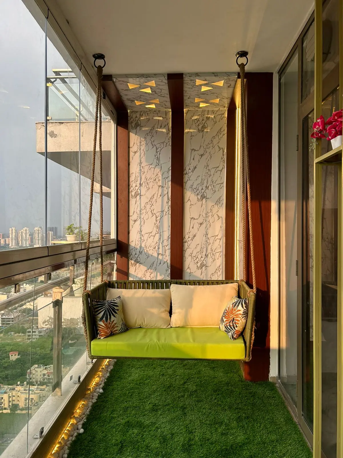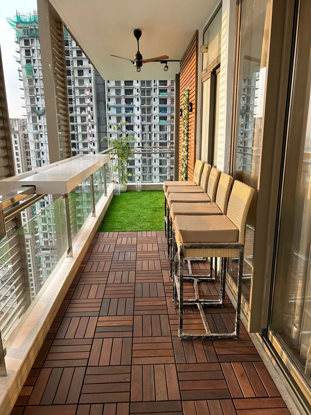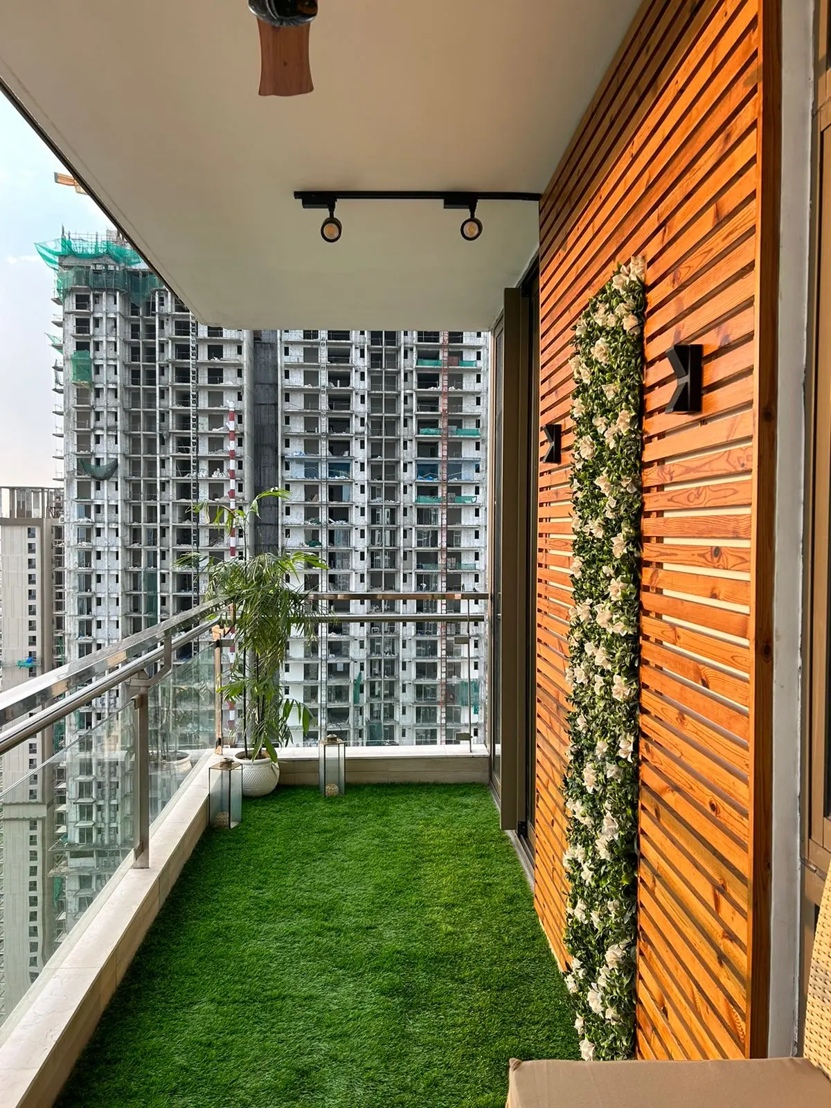 Spanning 300 sqft across two connected balconies at M3M Golf Estate, this project was envisioned as a seamless outdoor living experience. A custom wooden backdrop anchors the space, while deck tiles and grass flooring create layered zones for comfort and movement. Bespoke L-shaped seating enhances the sense of openness, and curated planters soften the architectural lines. Designed as a cohesive extension of the home, the dual setup transforms scale into elegance and everyday usability.