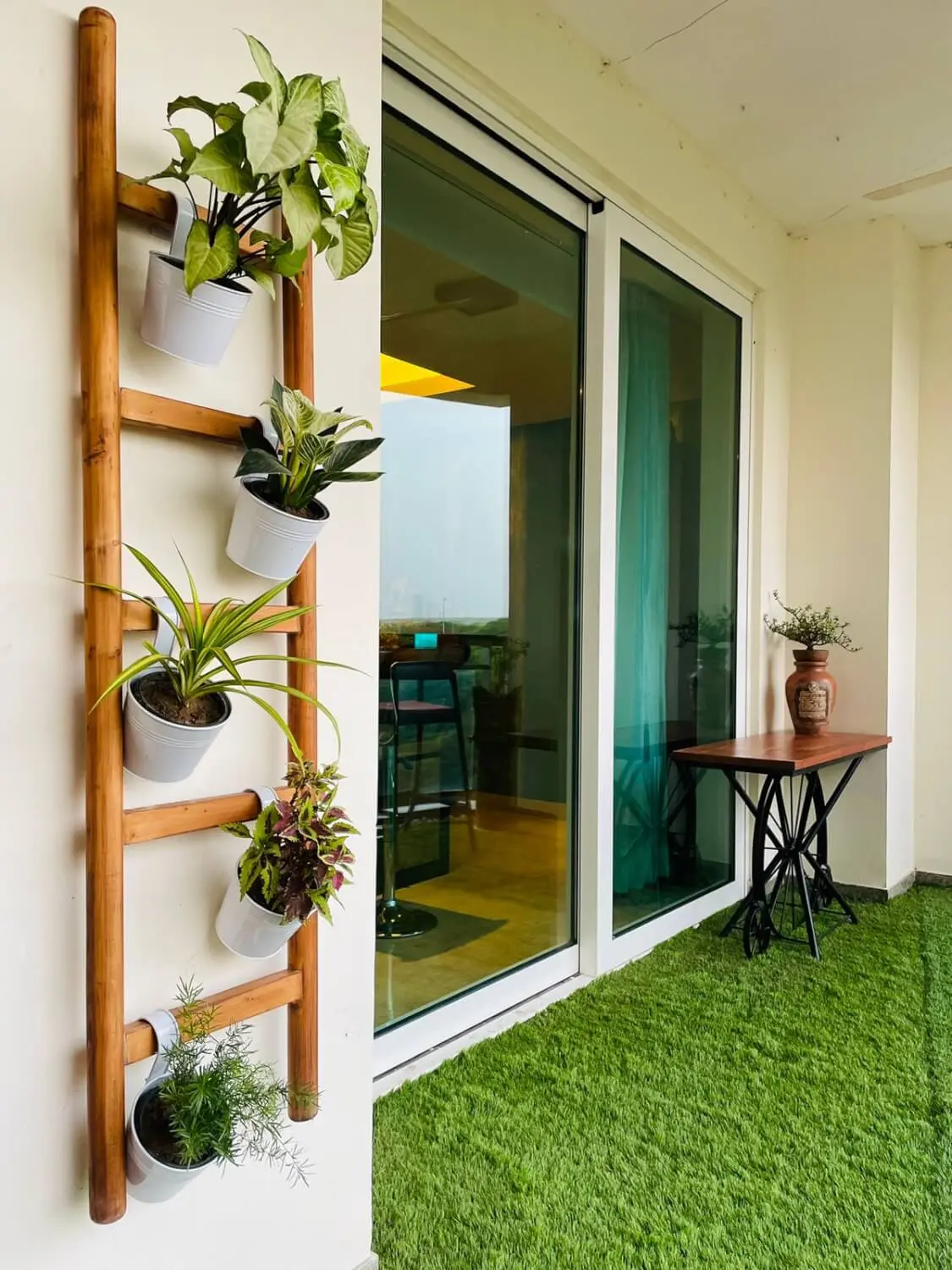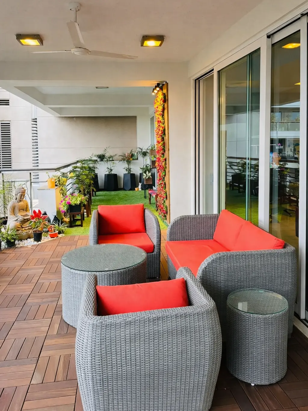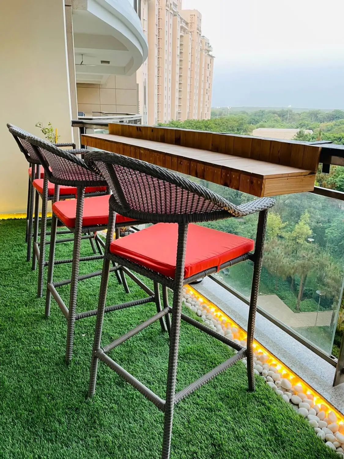 This 162 sqft long balcony at DLF The Camellias was designed to make the most of its linear layout while maintaining a sense of flow and balance. A railing table creates a practical edge for coffee or casual dining, while curated furniture anchors the seating zone. The Buddha fountain and textured wall backdrop introduce a calm focal point, complemented by layered planters that soften the structure. The result is a contemporary outdoor extension that feels structured, serene, and inviting for everyday living.