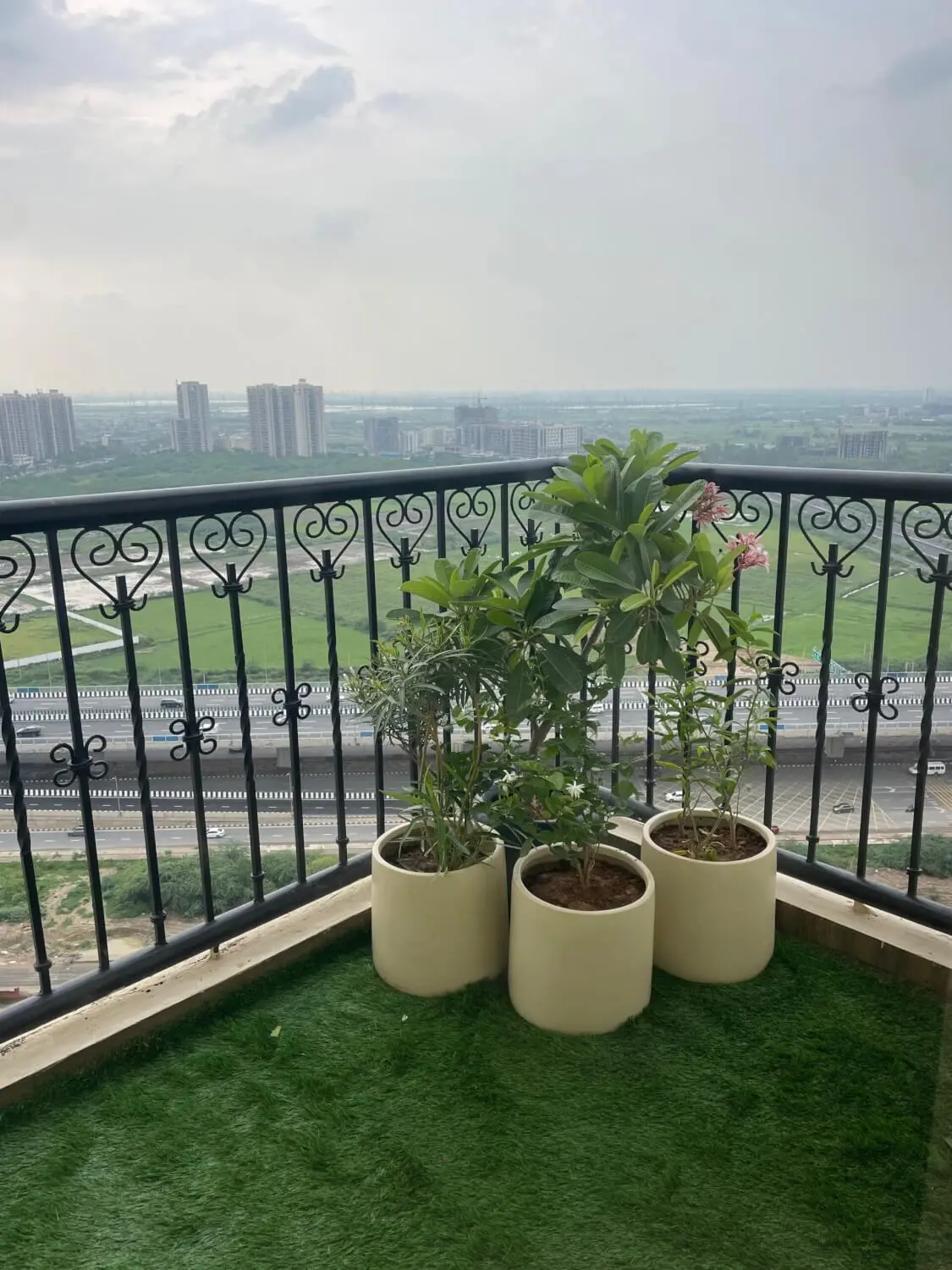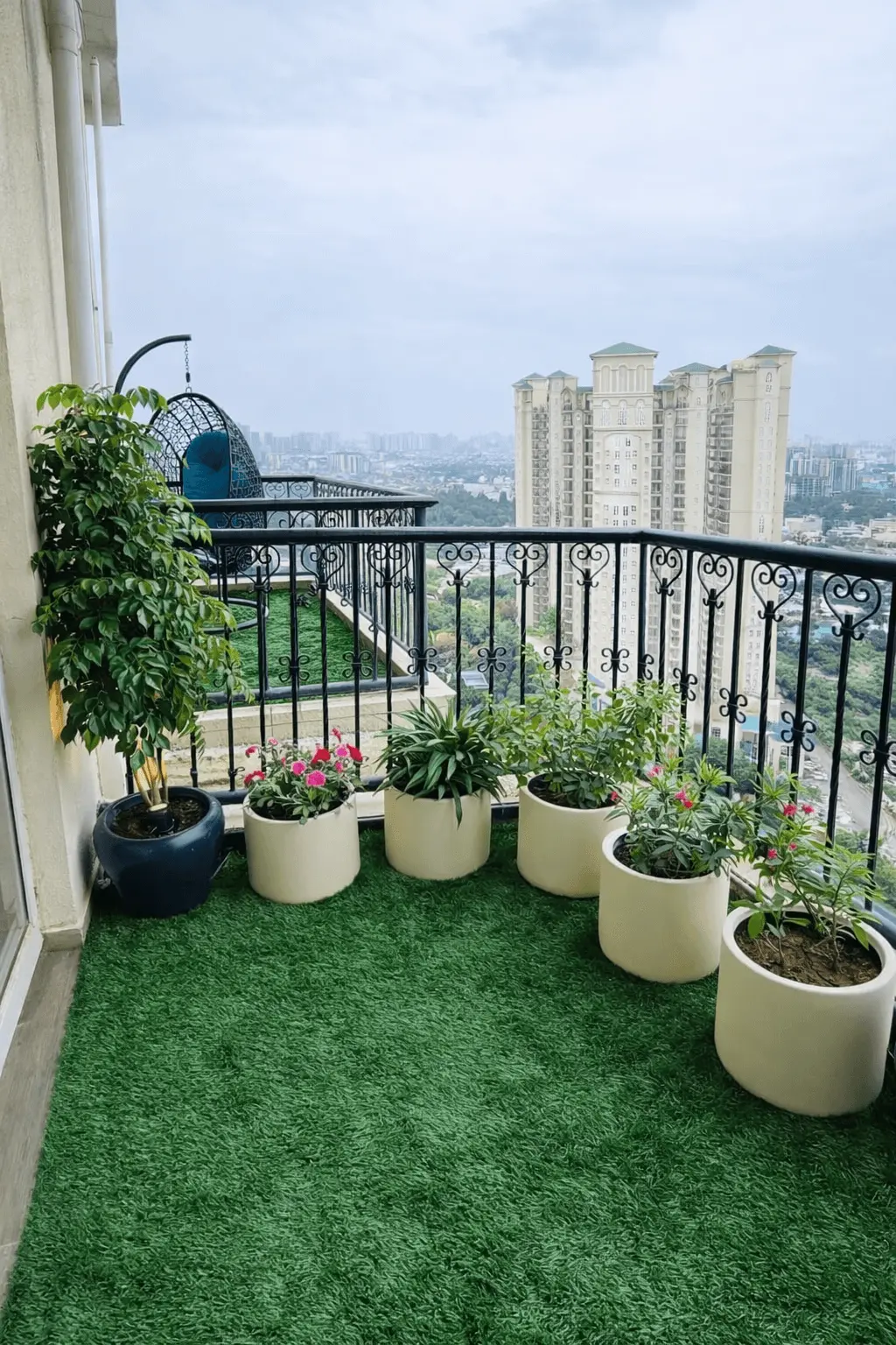 This 115 sq ft balcony at ATS Triumph was designed as a fully styled outdoor extension of the home. Layered flooring — combining decking and artificial grass — creates visual depth and defined zones within the space. Wall planters and screens introduce vertical interest, while carefully chosen décor and a portable water fountain add softness and movement. The result is an aesthetic balcony that feels immersive, balanced, and thoughtfully composed for everyday relaxation.