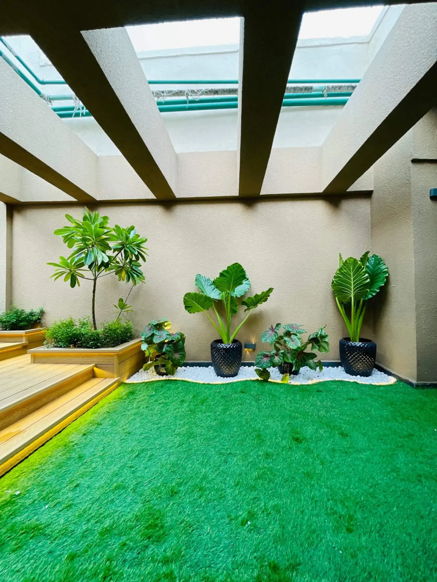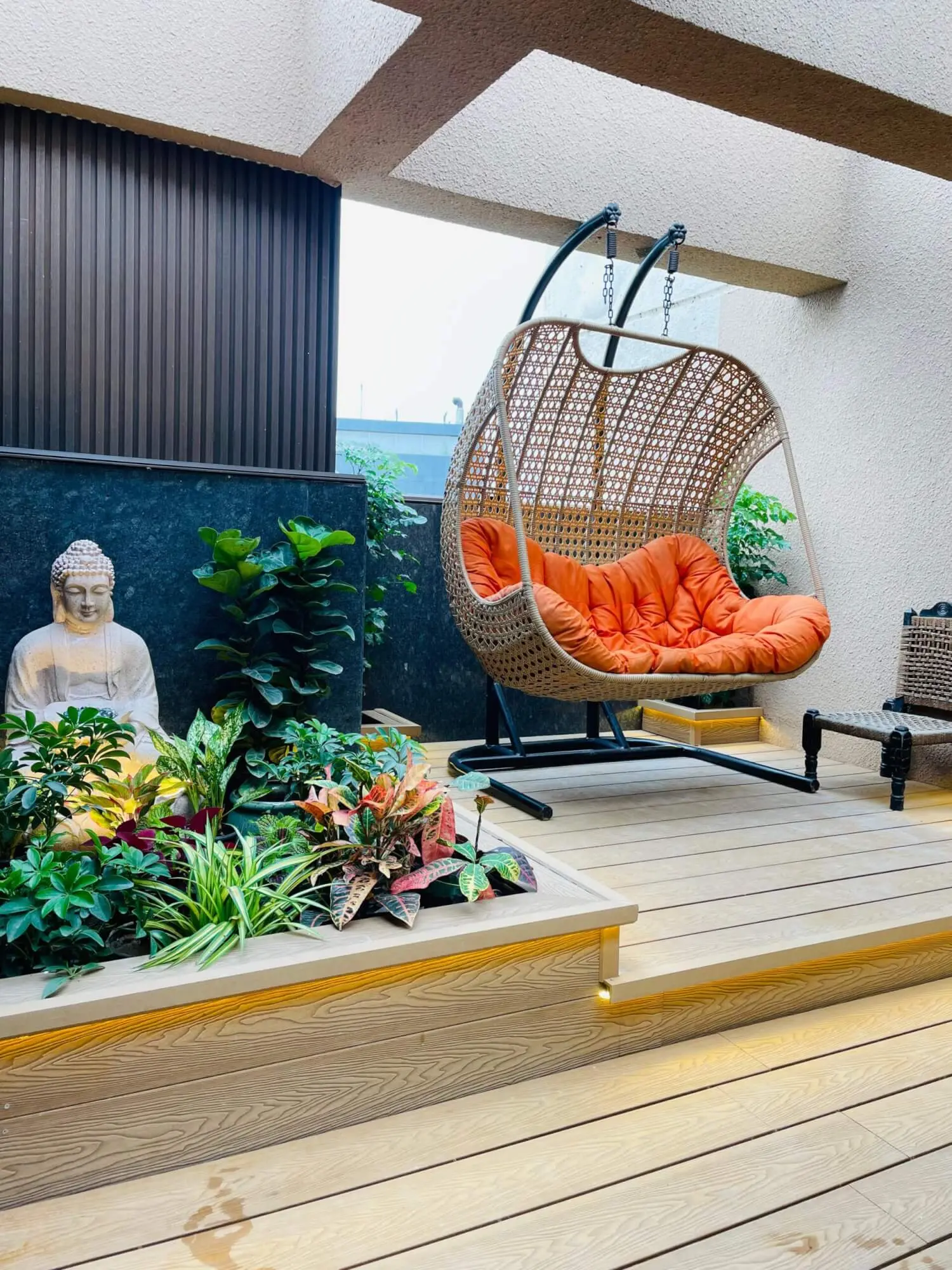 This 387 sq ft balcony at La Lagune was reimagined as a calm, contemporary escape from city life. Warm WPC decking sets the foundation, layered with thoughtfully placed planters that soften the space without overwhelming it. A Buddha fountain adds a gentle sensory rhythm, while comfortable seating and a swing invite slow mornings and unhurried evenings. Designed to feel grounded, open, and easy to live in, this balcony now blends nature, comfort, and quiet luxury — right at home.